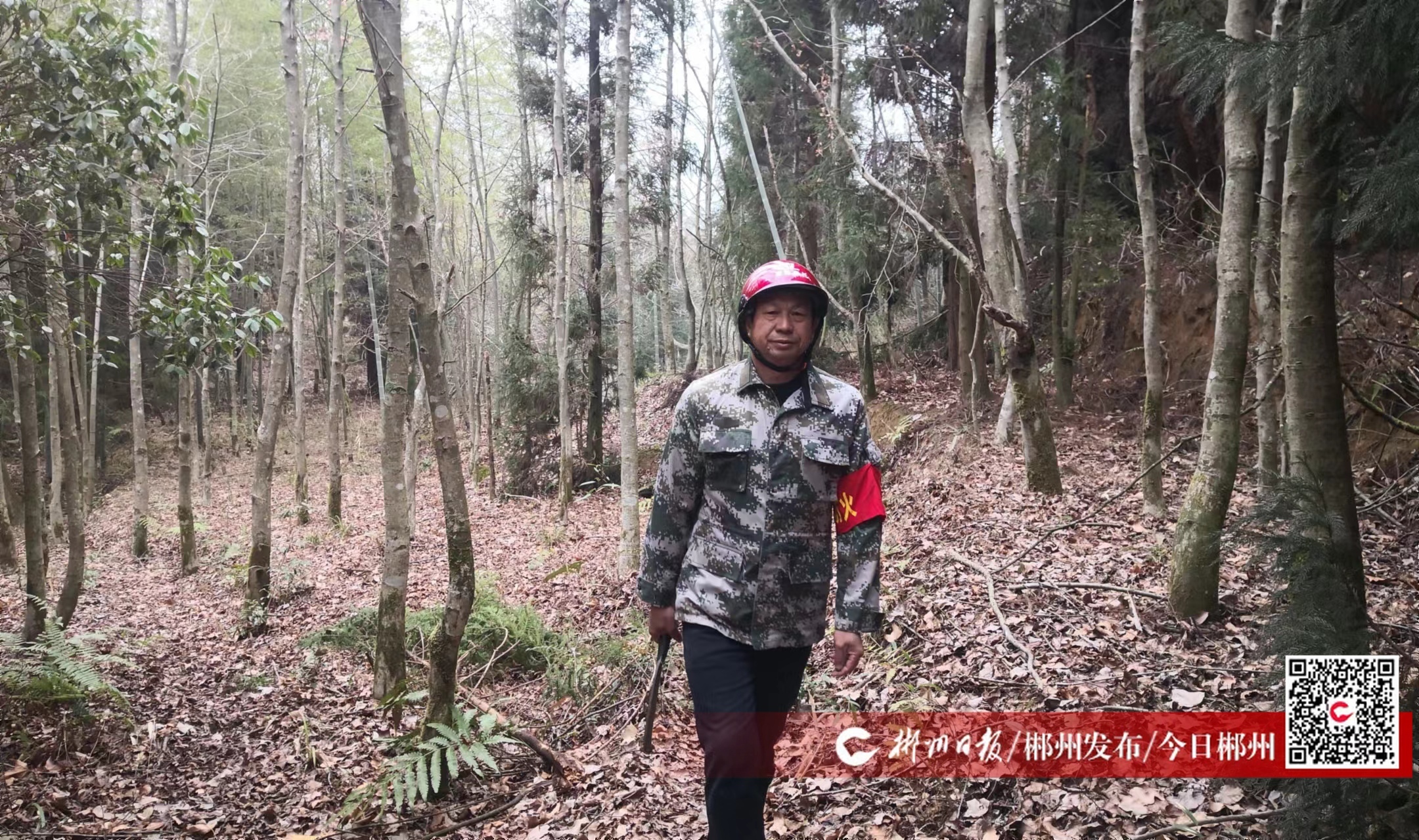 山路崎嶇,山林靜謐。2月7日早上9點(diǎn),北湖區(qū)仰天湖瑤族鄉(xiāng)梨樹下村的護(hù)林員劉理貴挎著水壺、提著柴刀在山林中巡護(hù)。
