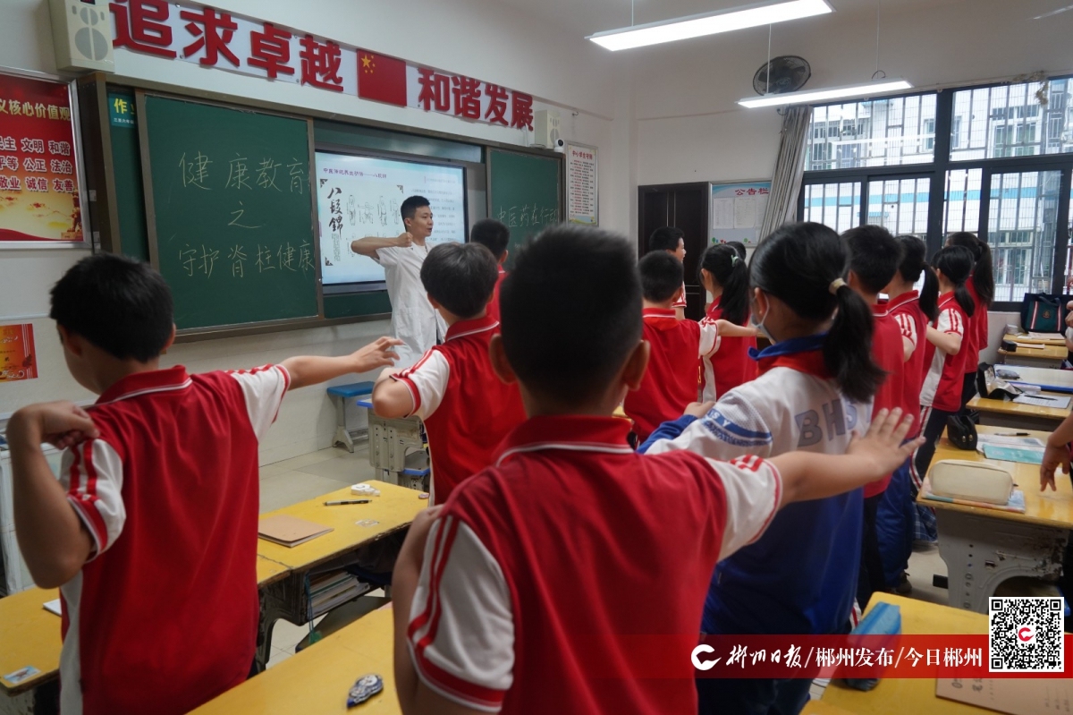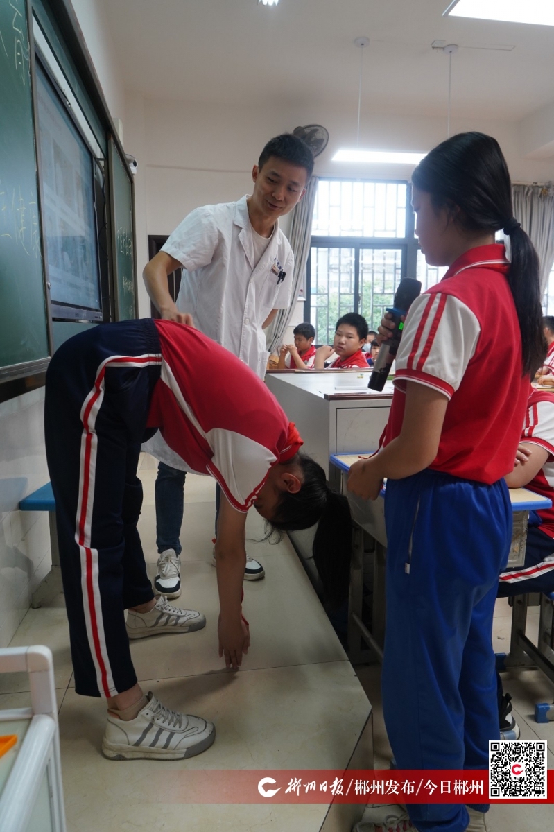 5月21日是世界脊柱健康日,今年的宣傳主題是“關(guān)愛脊柱 挺出精彩”。脊柱側(cè)彎是影響青少年身心健康的嚴(yán)重問題,也是青少年在成長過程中家長和孩子容易忽視的問題。此次主題班會(huì),學(xué)校邀請了郴州市中醫(yī)醫(yī)院運(yùn)動(dòng)康復(fù)醫(yī)學(xué)專家杜龔,為學(xué)生講解青少年脊柱側(cè)彎的相關(guān)知識(shí),通過播放中醫(yī)藥科普動(dòng)畫短片、展示不良坐姿圖片等方式,讓學(xué)生認(rèn)識(shí)脊柱側(cè)彎的危害,引導(dǎo)學(xué)生在生活習(xí)慣、日常飲食等方面養(yǎng)成關(guān)注脊柱健康的好習(xí)慣。最后杜龔還指導(dǎo)學(xué)生學(xué)習(xí)中醫(yī)藥傳統(tǒng)養(yǎng)生功法——八段錦,增強(qiáng)學(xué)生體質(zhì),對(duì)脊柱進(jìn)行有效的鍛煉。