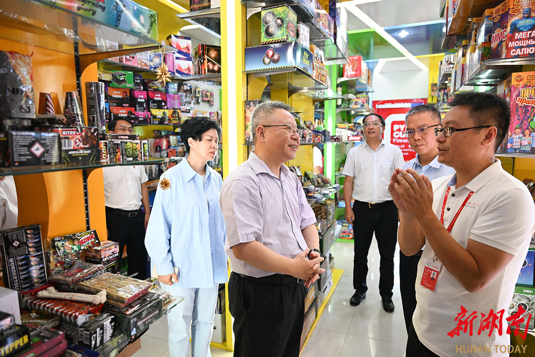 (8月7日,沈曉明來到吉利鞭炮煙花有限公司,仔細詢問煙花爆竹生產(chǎn)、物流運輸、外貿(mào)出口等情況。 )