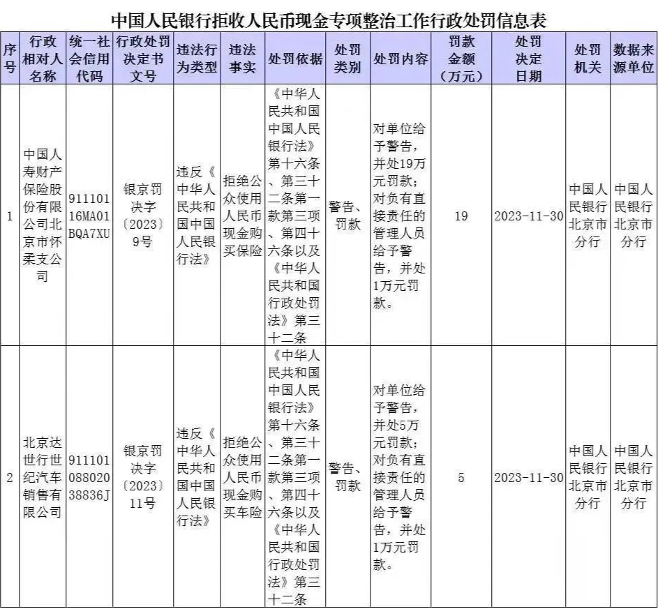 中國人民銀行發(fā)布的處罰信息顯示,此次被曝光的單位是中國人壽財(cái)產(chǎn)保險(xiǎn)股份有限公司北京市懷柔支公司、北京達(dá)世行世紀(jì)汽車銷售有限公司,罰款金額分別為19萬元和5萬元。這2家公司主要因?yàn)榫芙^公眾使用人民幣現(xiàn)金購買保險(xiǎn)、購買車險(xiǎn)等違法事實(shí)被處罰。