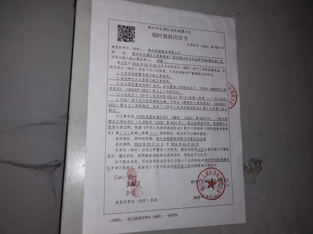 為切實(shí)做好消防安全集中除患攻堅(jiān)大整治行動(dòng),確保轄區(qū)火災(zāi)形勢(shì)穩(wěn)定,3月12日,北湖區(qū)消防救援大隊(duì)依法對(duì)一存在多處火災(zāi)隱患的服飾有限公司實(shí)施臨時(shí)查封。