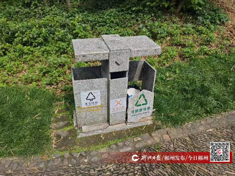 5月5日,記者在蘇仙嶺風(fēng)景區(qū)看到,景區(qū)內(nèi)的部分垃圾桶遭到破壞,有的垃圾箱蓋子被破壞,有的垃圾箱正面的分類標(biāo)識(shí)牌被損壞,這些遭到破壞的垃圾桶大大影響了景區(qū)的形象。