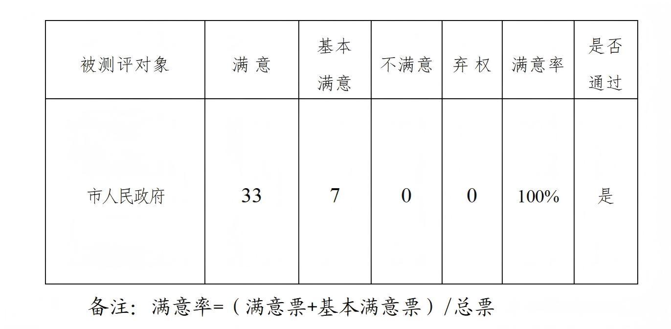 2025年8月27日上午,市六屆人大常委會第二十八次會議聽取和審議了市人民政府《關(guān)于中小企業(yè)促進(jìn)“一法一辦法”和〈湖南省先進(jìn)制造業(yè)促進(jìn)條例〉執(zhí)法檢查問題整改情況的報告》,并以無記名投票方式進(jìn)行了滿意度測評。當(dāng)日,市人大常委會會議應(yīng)到常委會組成人員48人,實到40人,經(jīng)電子表決,滿意度測評結(jié)果如下: