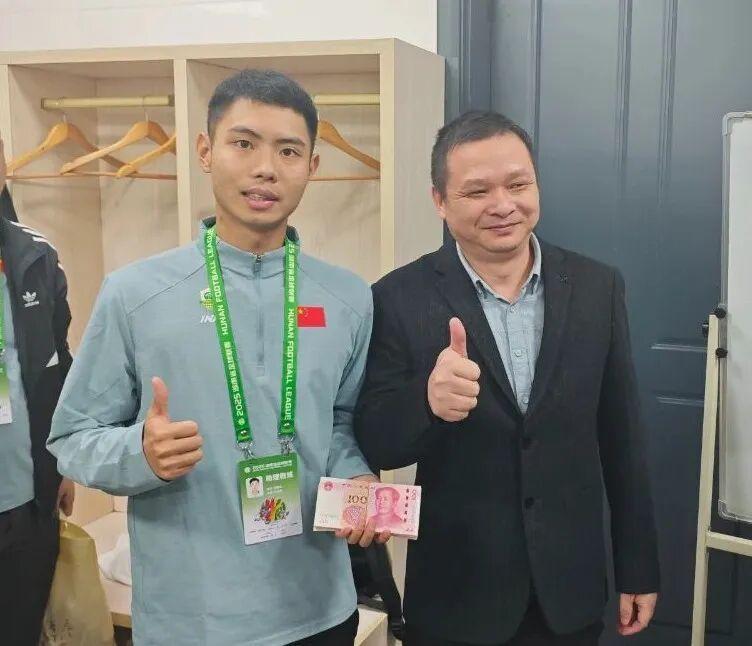 10月24日,“湘超”聯(lián)賽第七輪焦點(diǎn)戰(zhàn)中,郴州隊(duì)主場(chǎng)1:1戰(zhàn)平婁底隊(duì)。比賽剛落下帷幕,郴州市體育中心燈光尚未熄滅,郴州市汝城溫泉福泉湯谷公司立即履行賽前承諾,來(lái)到郴州隊(duì)更衣室中,將賽前承諾的一萬(wàn)元進(jìn)球獎(jiǎng)金送到了郴州隊(duì)工作人員手中。