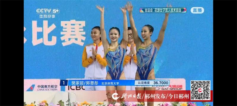 11月15日,第十五屆全國運動會花樣游泳女子雙人技術(shù)自選決賽落幕,來自郴州的姑娘樊家懿與北京體育大學(xué)隊友郭思彤?dāng)y手出戰(zhàn),憑借精湛的技術(shù)和默契的配合斬獲了銅牌。