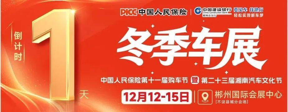 12月12日至15日,2025郴州冬季車(chē)展——“中國(guó)人民保險(xiǎn)第十一屆購(gòu)車(chē)節(jié)暨第二十三屆湘南汽車(chē)文化節(jié)”將在郴州國(guó)際會(huì)展中心(不另設(shè)縣城分會(huì)場(chǎng))舉行。