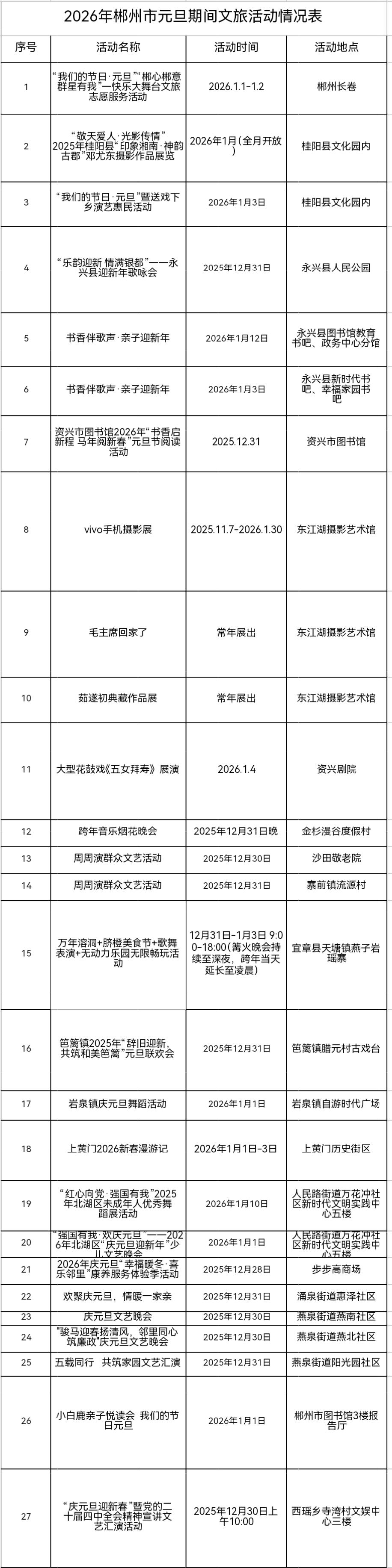 2026年元旦期間,郴州市將舉辦27場豐富多彩的文化旅游活動(dòng),為市民和游客獻(xiàn)上一場文化盛宴。