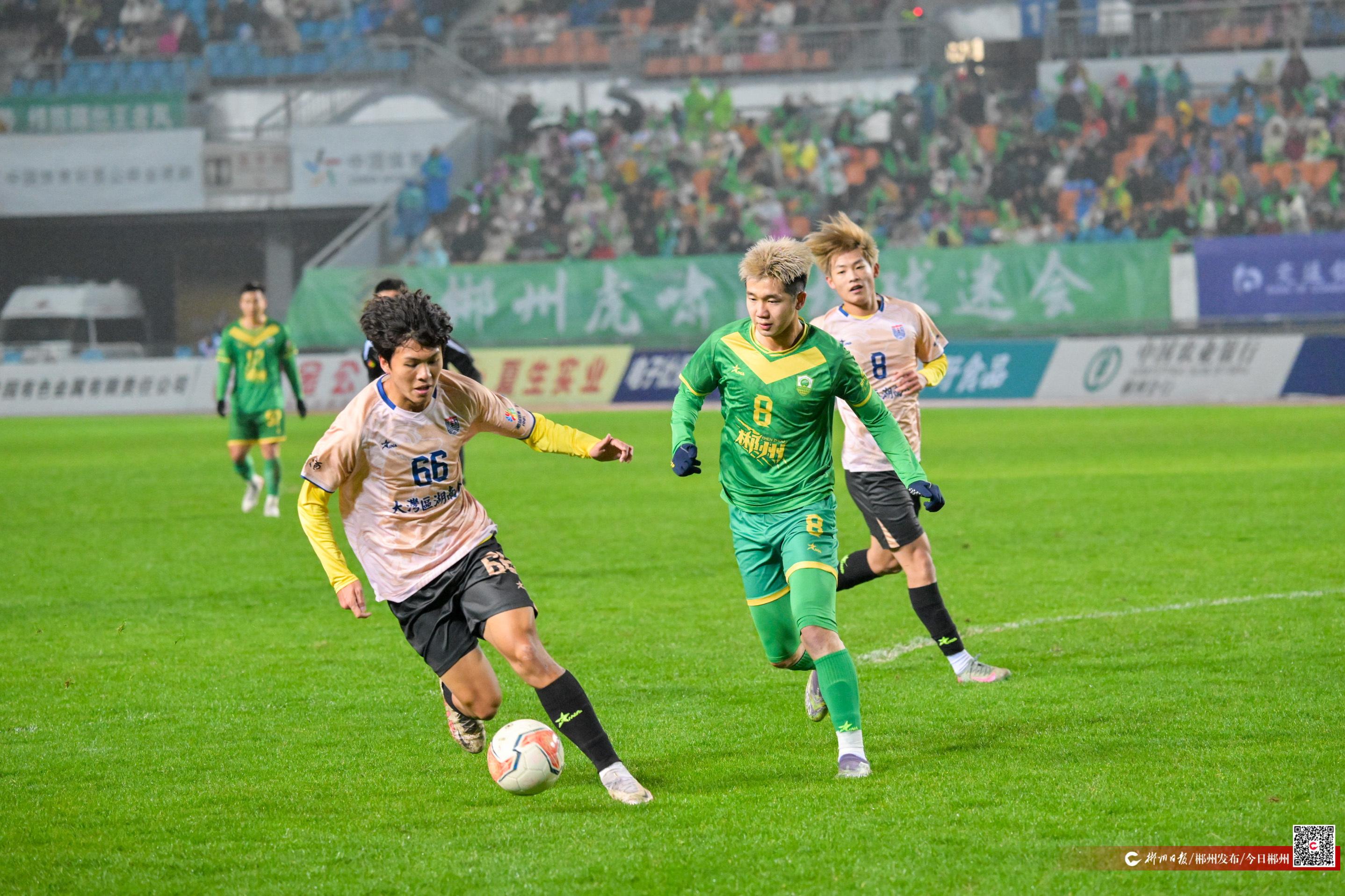 19時38分,隨著主裁一聲哨響,比賽正式開始。開場第4分鐘,場上便掀起首輪高潮——郴州隊55號李章毓接隊友8號蔣政傳球,在禁區(qū)弧頂處果斷拔腳怒射,皮球擊中橫梁彈出,錯失了改寫比分的絕佳機會。第12分鐘,郴州隊開出角球,李章毓利用身高優(yōu)勢在禁區(qū)內搶點攻門,對方28號守門員吳晨奮力撲出,化解險情。