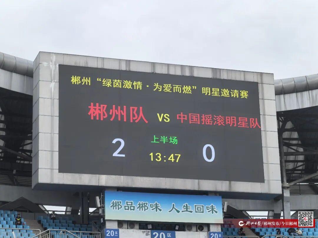 1月25日,郴州“綠茵激情?為愛而燃”明星足球邀請賽在郴州市體育中心打響。郴州隊(duì)VS中國搖滾明星隊(duì)。比賽13分鐘內(nèi),郴州隊(duì)王博和郭傳磊破門得分,目前比分2-0。