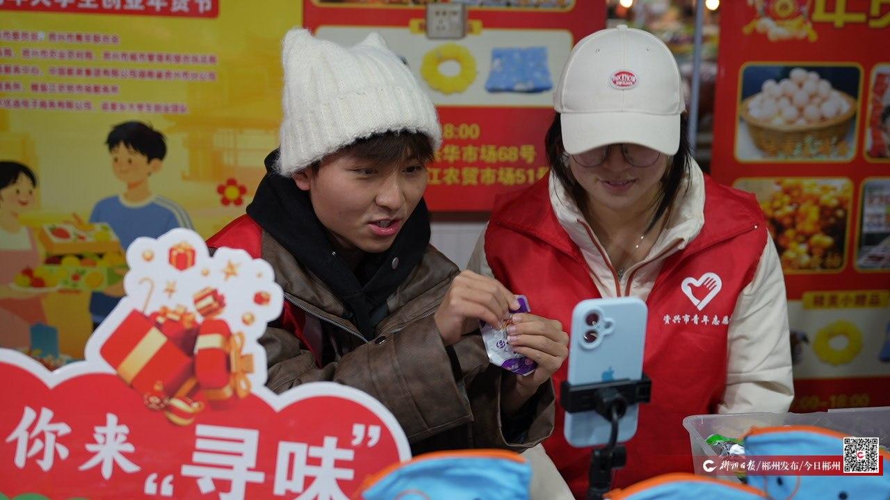 “這是咱們本地手工制作的東江福魚,肉質(zhì)鮮嫩、采用傳統(tǒng)工藝腌制,大家看這成色,現(xiàn)在點擊右下角鏈接就能直接下單!”2月3日,資興市興華市場和鯉魚江農(nóng)貿(mào)市場內(nèi),大學(xué)生創(chuàng)業(yè)年貨節(jié)現(xiàn)場暖意融融、人聲鼎沸,此起彼伏的吆喝聲與交談聲交織在一起。返鄉(xiāng)大學(xué)生張子涵拿著一塊剛拆袋的東江福魚,一邊展示魚肉紋理,一邊對著手機鏡頭講解,直播間里評論瞬間刷屏,后臺訂單不斷刷新。這正是資興市“返家鄉(xiāng)”大學(xué)生寒假實踐的生動一幕。