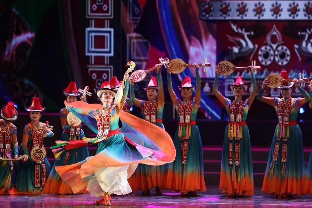 2026年1月7日,甘肅省張掖市裕固美舞蹈團(tuán)的演員在甘肅省群眾文藝展演展播活動(dòng)首場(chǎng)演出中表演民族舞蹈。