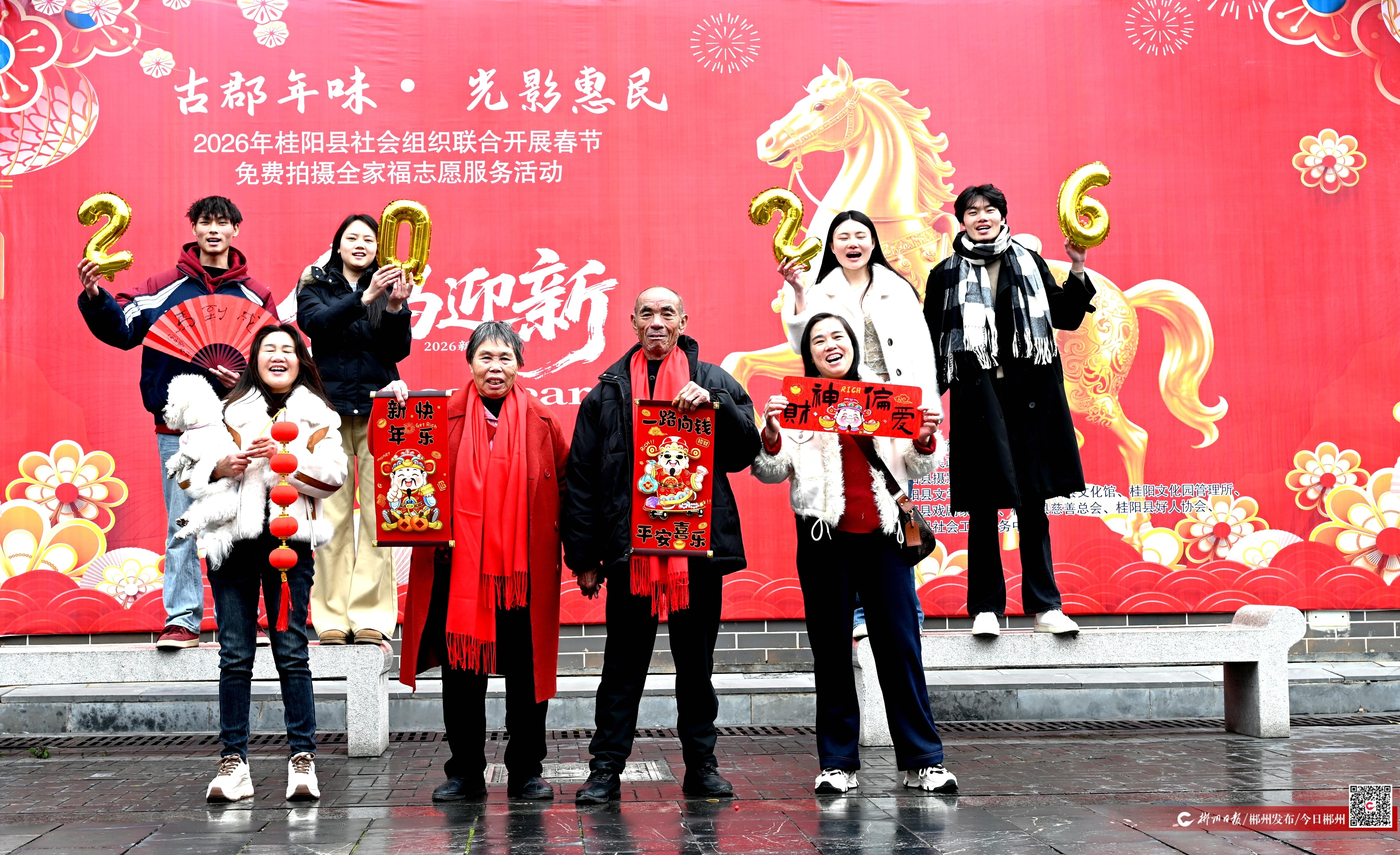 大紅燈籠高掛,歡歌笑語不斷。2月17日,農歷正月初一,桂陽縣文化園古郡城內年味格外濃郁。上午9時,由桂陽縣攝影家協(xié)會組織的“古郡年味·光影惠民”2026年春節(jié)免費拍攝合照志愿服務活動準時拉開帷幕,用鏡頭為市民和游客捕捉新春團圓的幸福瞬間。