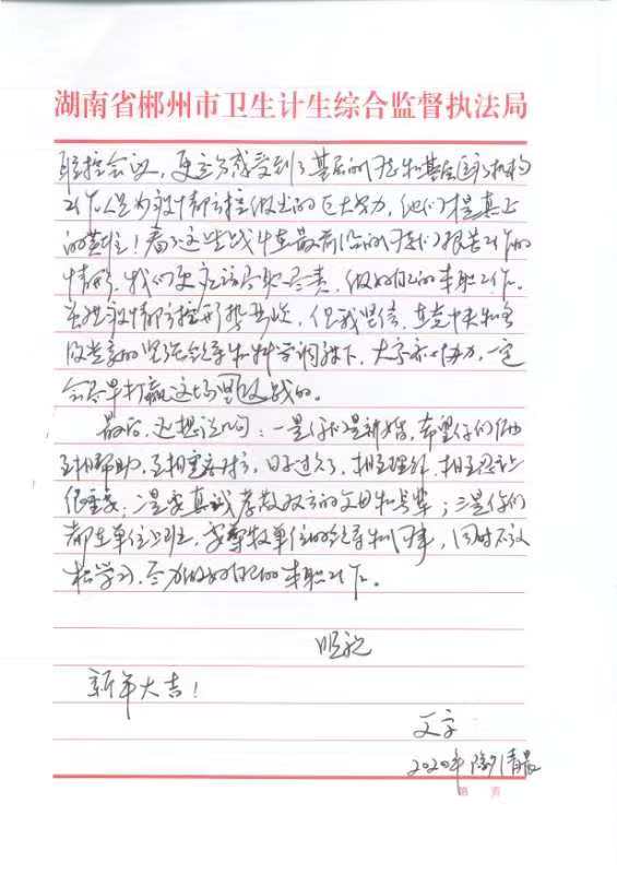 家書一開頭,市衛(wèi)生計(jì)生綜合監(jiān)督執(zhí)法局黨委書記、局長(zhǎng)袁必雄向女兒女婿表達(dá)了歉意,并點(diǎn)明了郴州市新型肺炎防控的緊迫性?!拔?guī)ш?duì)參與了確診宜章1例新型冠狀病毒感染肺炎的工作,參加了宜章縣的聯(lián)防聯(lián)控會(huì)議,充分感受到了基層醫(yī)療機(jī)構(gòu)工作人員為疫情防控做出的巨大努力,他們才是真正的英雄!”