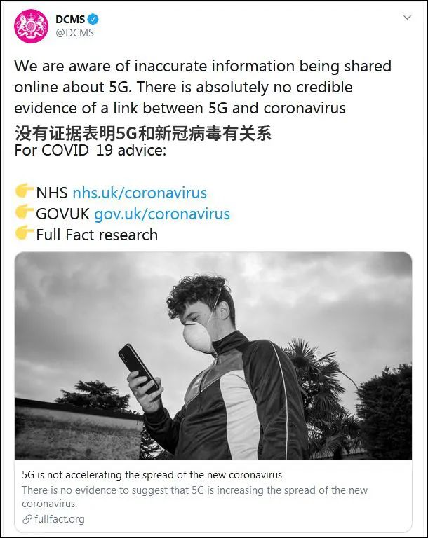 英國數(shù)字、文化、媒體和體育部(Department for Digital, Culture, Media and Sport)3日在推特上的一份聲明中表示,“意識到有關(guān)5G的不準(zhǔn)確信息在網(wǎng)上被分享……完全沒有可信的證據(jù)表明,5G和新冠病毒之間存在聯(lián)系。”