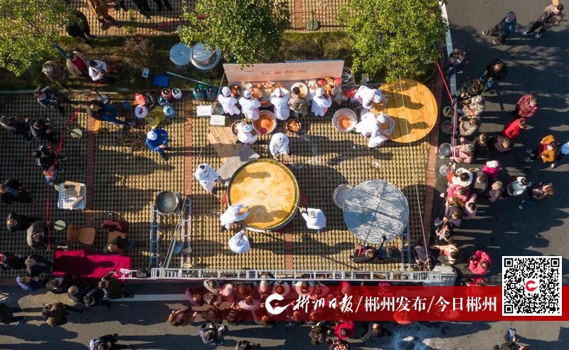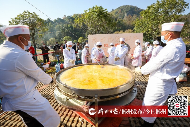 12月2日,在宜章縣漿水鄉(xiāng)石虎山景區(qū),宜章縣油茶協(xié)會(huì)用山茶油炸出了一個(gè)直徑為1.68米的超大紅薯糍粑,吸引了眾多游客拍照留念。