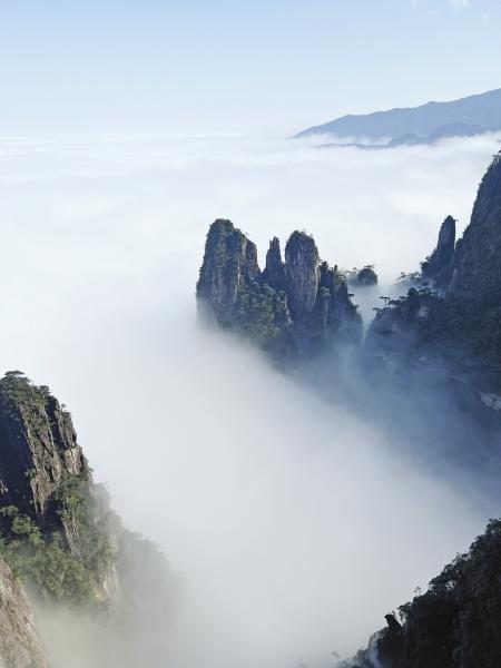 棧道修筑在絕壁之上。腳下是數(shù)百米,甚至上千米的高空,五六米開外又是白霧,驚險中混雜著神秘。云霧有時散開,可遠遠看到山巒各異的形態(tài):這樣看是金鞭神柱,另一個角度看又神似“渡海觀音”。加入一些天馬行空的想象,還不乏姜太公釣魚之類的奇景。