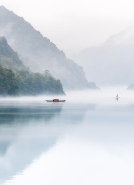 到達觀景站臺,峽谷間也逐漸光亮起來。江面升起層層薄霧,絲帶一般環(huán)繞在翠峰屏列的峽谷間,一時間有點恍惚,仿佛自己是在觀看一幅動態(tài)的中式山水畫卷。霧色雖美,但心中總會覺得還缺點什么,直到一艘艘小漁船駛向蒙蒙白霧中,這幅秀美的山水畫卷才算徹底完整。