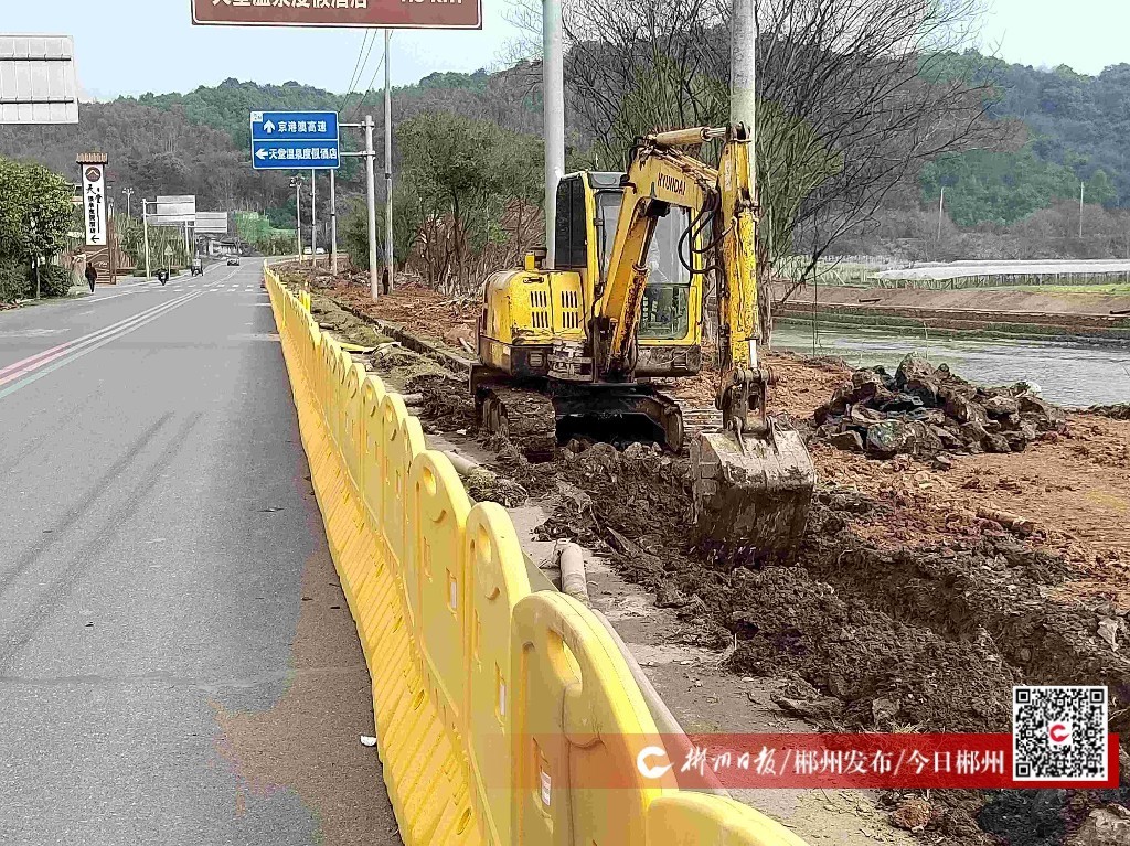 2月18日,蘇仙區(qū)造香公路提質(zhì)改造項(xiàng)目工地,挖掘機(jī)揮舞長(zhǎng)臂作業(yè),施工人員有序清理綠化樹(shù)木,一派熱火朝天的景象。