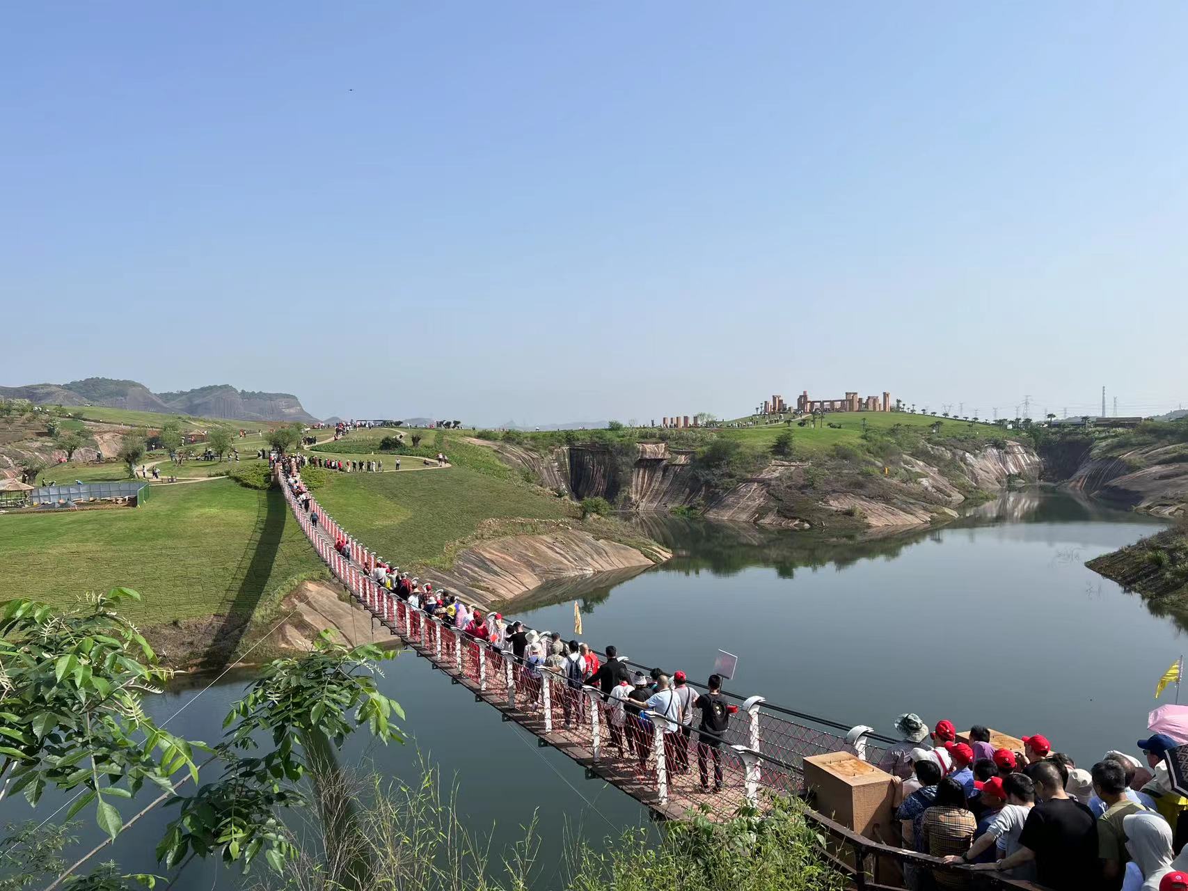 經(jīng)過約40分鐘的車程,千人團第一站到達高椅嶺景區(qū)。趁著春日暖陽,游客們走過繩索橋、攀登丹霞山,游覽之余,還不忘拍照打卡。作為郴州文旅網(wǎng)紅景點之一,大家在驚嘆高椅嶺險峻的同時,也為郴州豐富的自然資源點贊。