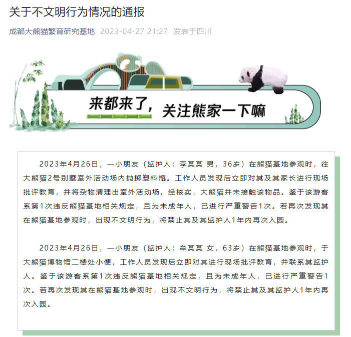 4月27日,成都大熊貓繁育研究基地發(fā)布《關(guān)于不文明行為情況的通報》: