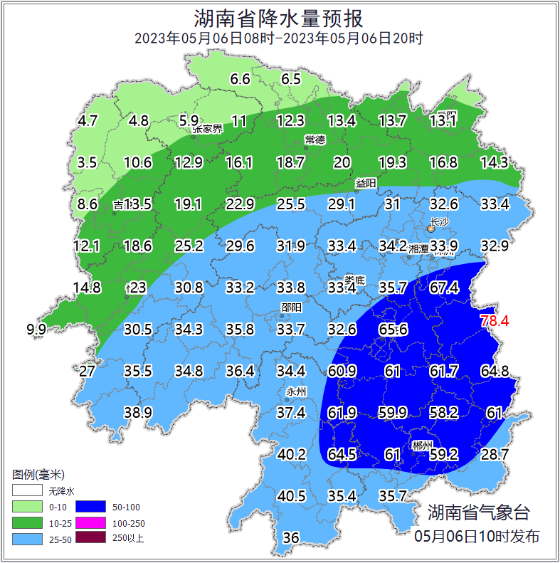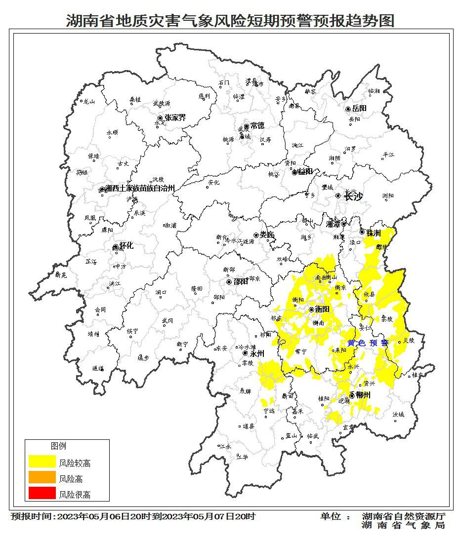 根據(jù)地質(zhì)災(zāi)害成災(zāi)規(guī)律和孕災(zāi)條件,結(jié)合2023年5月6日短期氣象預(yù)報情況,省自然資源廳與省氣象局聯(lián)合會商得出如下結(jié)論:自5月6日20:00至7日20:00,受降雨影響,湘東、湘中、 湘南部分區(qū)域發(fā)生突發(fā)性地質(zhì)災(zāi)害風(fēng)險較高(黃色預(yù)警)。