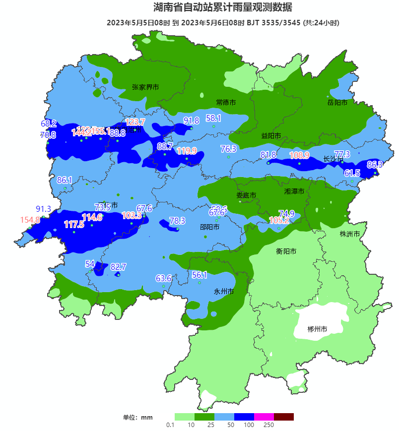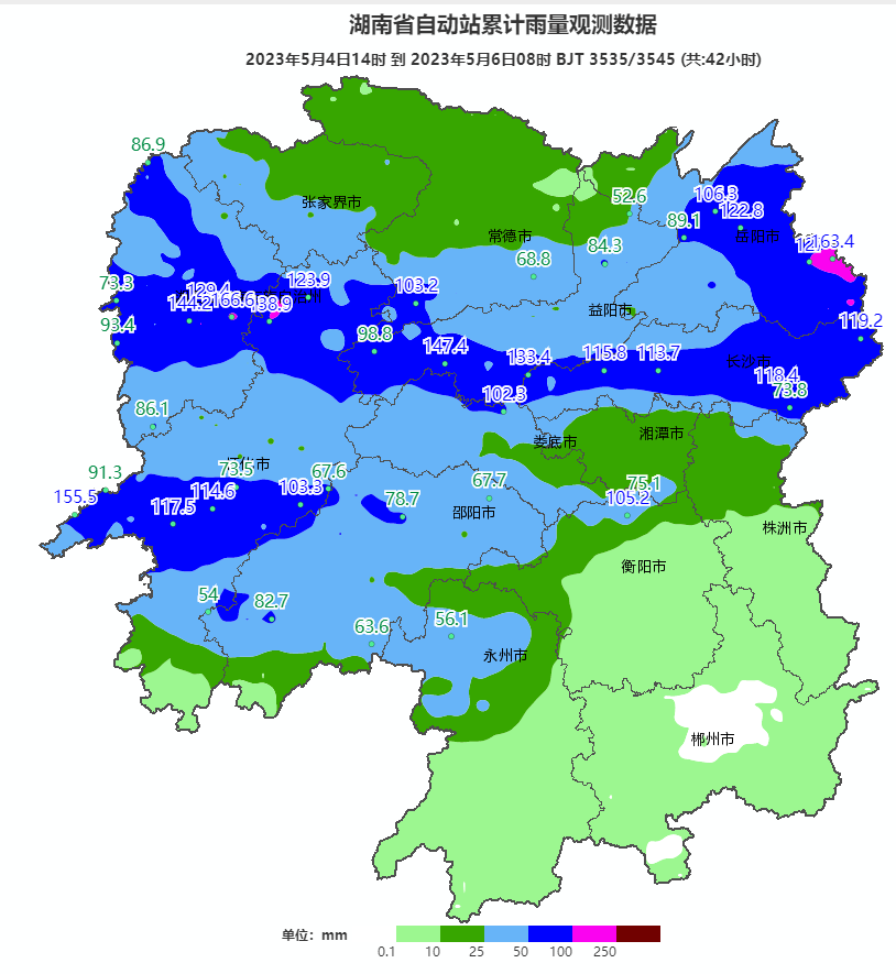 據(jù)湖南省氣象臺預(yù)測,4日中午開始我省出現(xiàn)一輪強降雨過程,截至6日08時,全省平均降水量29.4毫米,強降雨主要集中在湘西州、懷化、益陽、岳陽、長沙、邵陽等地。全省共58個市縣區(qū)752站累計雨量超過50毫米,其中湘西州(保靖、古丈、花垣)、常德(桃源)、益陽(安化)、岳陽(平江、岳陽縣、臨湘)、長沙(全境)、婁底(漣源)、懷化(芷江、洪江、新晃、沅陵、中方)、衡陽(衡山)22個市縣區(qū)98站超過100毫米,最大為古丈巖頭寨166.6毫米;其間,18個縣市區(qū)39站小時雨強超過50毫米,最大為平江大江洞水庫79.6毫米(4日20時至21時);31個市縣區(qū)49站出現(xiàn)極8級以上大風(fēng),最大為資陽區(qū)茈湖口站31.8米/秒(11級,4日17時);4日傍晚,永順、龍山出現(xiàn)冰雹。