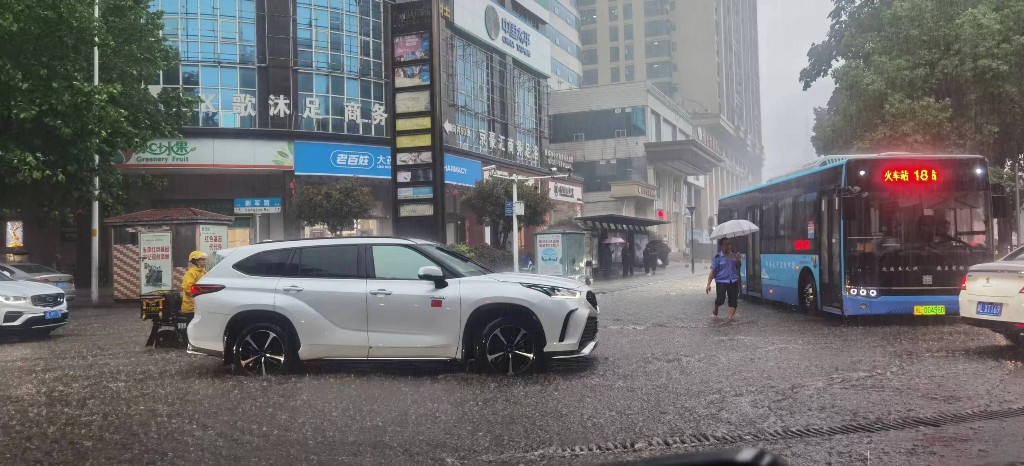 當(dāng)天,郴州城區(qū)驟降暴雨,導(dǎo)致城區(qū)許多路段出現(xiàn)了擁堵現(xiàn)象。上午10時(shí),公交車司機(jī)鄧勇軍駕駛55路公交車開往高鐵西站,在途經(jīng)南嶺大道郴州廣電路段的輔道時(shí),發(fā)現(xiàn)前方道路積水嚴(yán)重,還因一輛私家車拋錨出現(xiàn)了嚴(yán)重的擁堵現(xiàn)象。同時(shí),他還從后視鏡中看到,自己車后滯留了許多公交車和私家車。