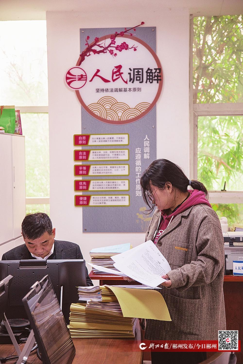 人民調(diào)解室內(nèi),工作人員忙著整理資料