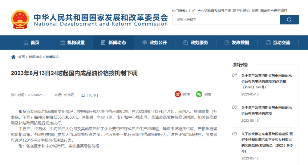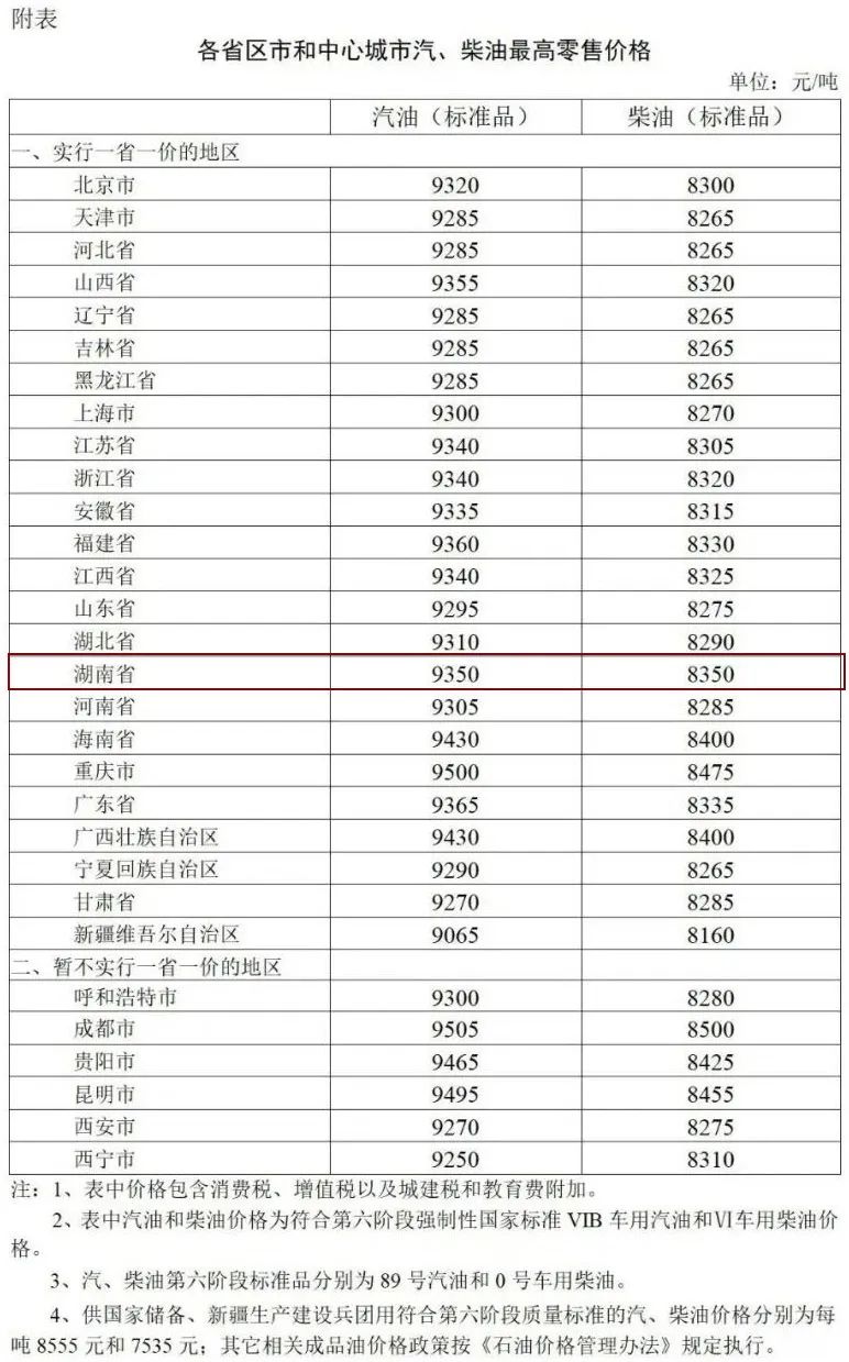 根據(jù)近期國際市場油價(jià)變化情況,按照現(xiàn)行成品油價(jià)格形成機(jī)制,自2023年6月13日24時(shí)起,國內(nèi)汽、柴油價(jià)格(標(biāo)準(zhǔn)品,下同)每噸分別降低55元和50元。調(diào)整后,各?。▍^(qū)、市)和中心城市汽、柴油最高零售價(jià)格見附表。相關(guān)價(jià)格聯(lián)動(dòng)及補(bǔ)貼政策按現(xiàn)行規(guī)定執(zhí)行。