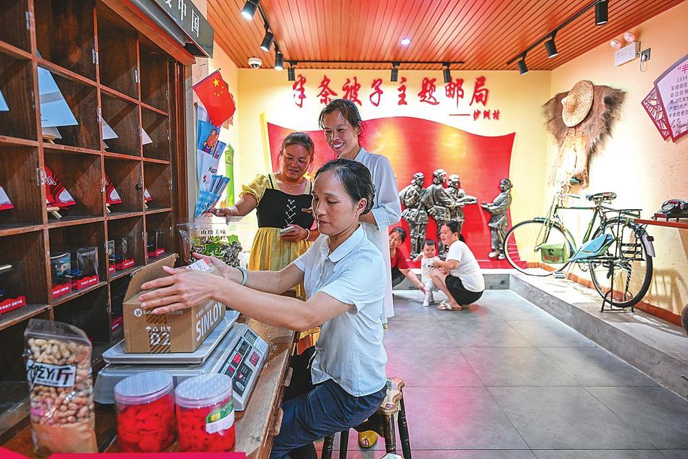 ▲游客在沙州村購買土特產(chǎn),通過“半條被子”主題郵局免費寄到目的地