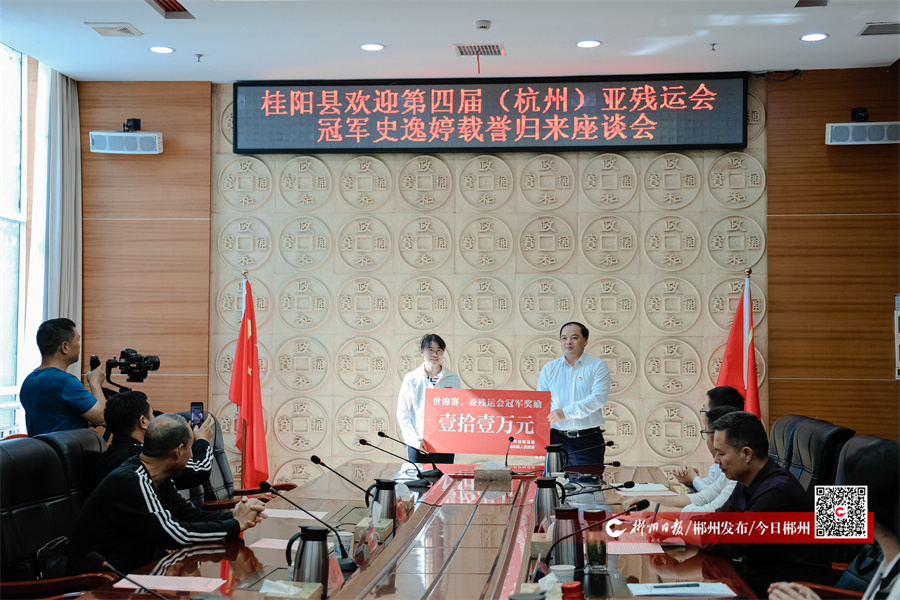 歡迎座談會上,桂陽縣為史逸婷頒發(fā)了獎金11萬元,桂陽縣委副書記、縣長李志強對史逸婷致歡迎詞,對她奪得冠軍表示熱烈祝賀,高度贊揚史逸婷為國家贏得了榮譽、為家鄉(xiāng)增添了光彩,是桂陽人民的驕傲。
