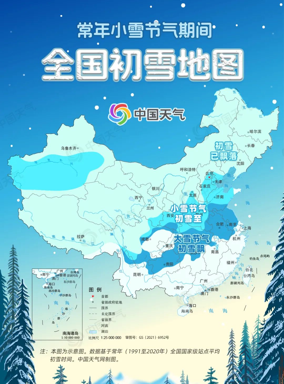 而從常年小雪節(jié)氣期間全國初雪地圖可以看出,除了華北、黃淮一帶會在小雪節(jié)氣期間迎來初雪以外,長江中下游地區(qū)一般要到大雪節(jié)氣才會見到雪花;至于再往南的華南地區(qū),一年中能不能見到雪確實就要看運(yùn)氣了。