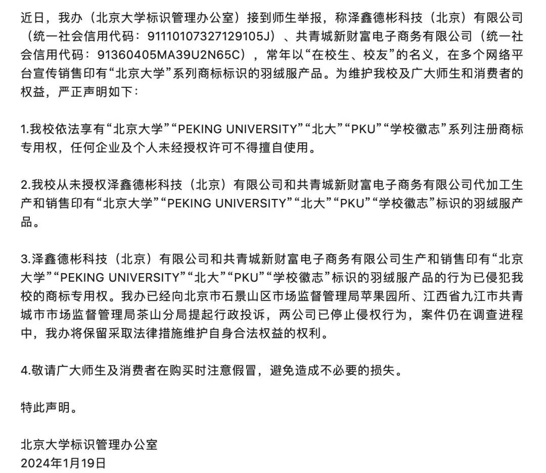 北京大學標識管理辦公室19日發(fā)布聲明稱:兩公司在多個網(wǎng)絡平臺宣傳銷售印有“北京大學”系列商標標識的羽絨服產(chǎn)品,該辦已提起行政投訴。