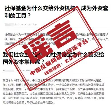 近段時間以來,有少數(shù)網(wǎng)絡(luò)自媒體發(fā)布視頻稱,我國社會保險基金“幾乎全部交給外資機(jī)構(gòu)管理”,且被用于“買賣A股”,質(zhì)疑社?;鸪蔀椤巴赓Y套利的工具”。經(jīng)中國互聯(lián)網(wǎng)聯(lián)合辟謠平臺向有關(guān)主管部門核實查證,前述言論均為不實信息。