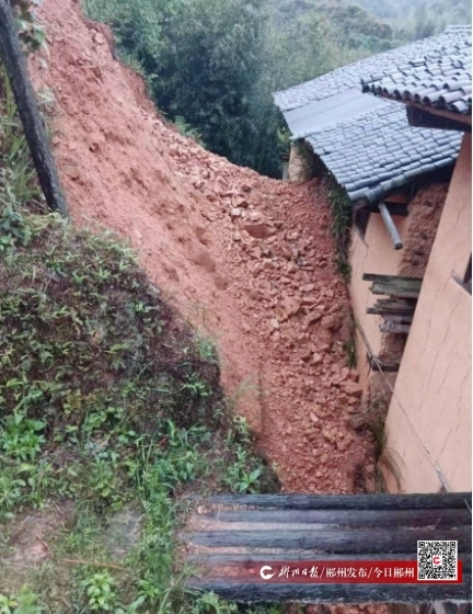 ▲汝城縣濠頭鄉(xiāng)廟前村的農(nóng)戶屋后出現(xiàn)山體滑坡、房屋進(jìn)水等情況