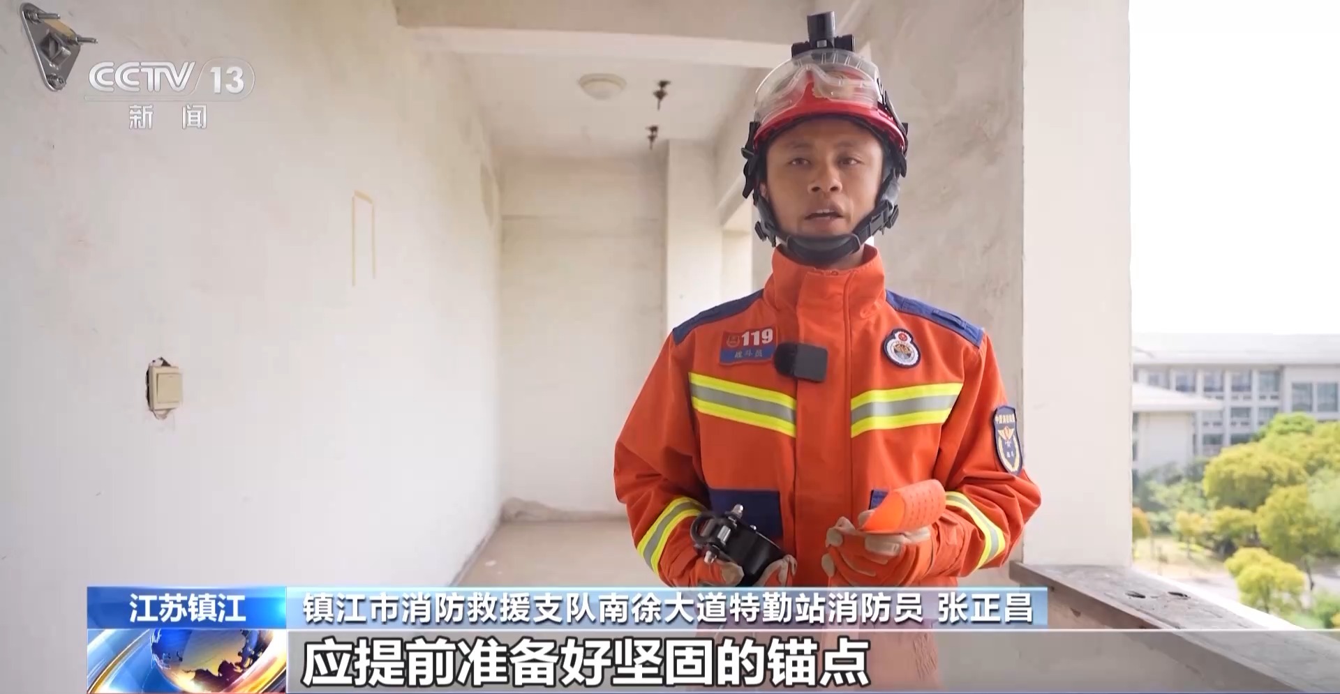 鎮(zhèn)江市消防救援支隊南徐大道特勤站消防員 張正昌:使用逃生緩降器時,應(yīng)提前準(zhǔn)備好堅固的錨點(diǎn),特別是靠近逃生窗口的,如果沒有預(yù)留錨點(diǎn),那就需要制作臨時錨點(diǎn),這個就需要提前準(zhǔn)備好延長用的安全繩索,否則就無法使用。在使用時,要提前拉緊鋼絲繩,如果這一段沒有拉直的話,我們離開窗口時就會發(fā)生沖墜,很容易導(dǎo)致受傷,甚至發(fā)生墜落。