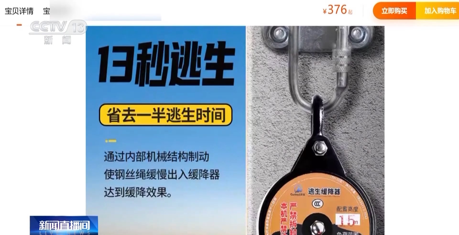 沒有消防產(chǎn)品身份碼,也就意味著該產(chǎn)品并未通過消防安全認(rèn)證,產(chǎn)品質(zhì)量可能存在重大隱患,消費(fèi)者選購時一定要注意甄別。記者注意到,網(wǎng)店商家宣傳,逃生緩降器可實現(xiàn)13秒逃生,省去一半逃生時間。真有這么高效嗎?一位消防員在做好安全防護(hù)情況下,對這款價格較高的合格產(chǎn)品進(jìn)行了測試。在使用已經(jīng)安裝到位的固定錨點(diǎn)的情況下,從5層樓安全降落到地面的時間接近兩分鐘。雖然沒有商家宣傳得那么快,但相對逃生繩,使用者只需要固定好安全帶,就能比較順利到達(dá)地面。不過,消防員提醒,使用這類產(chǎn)品也要多加注意。