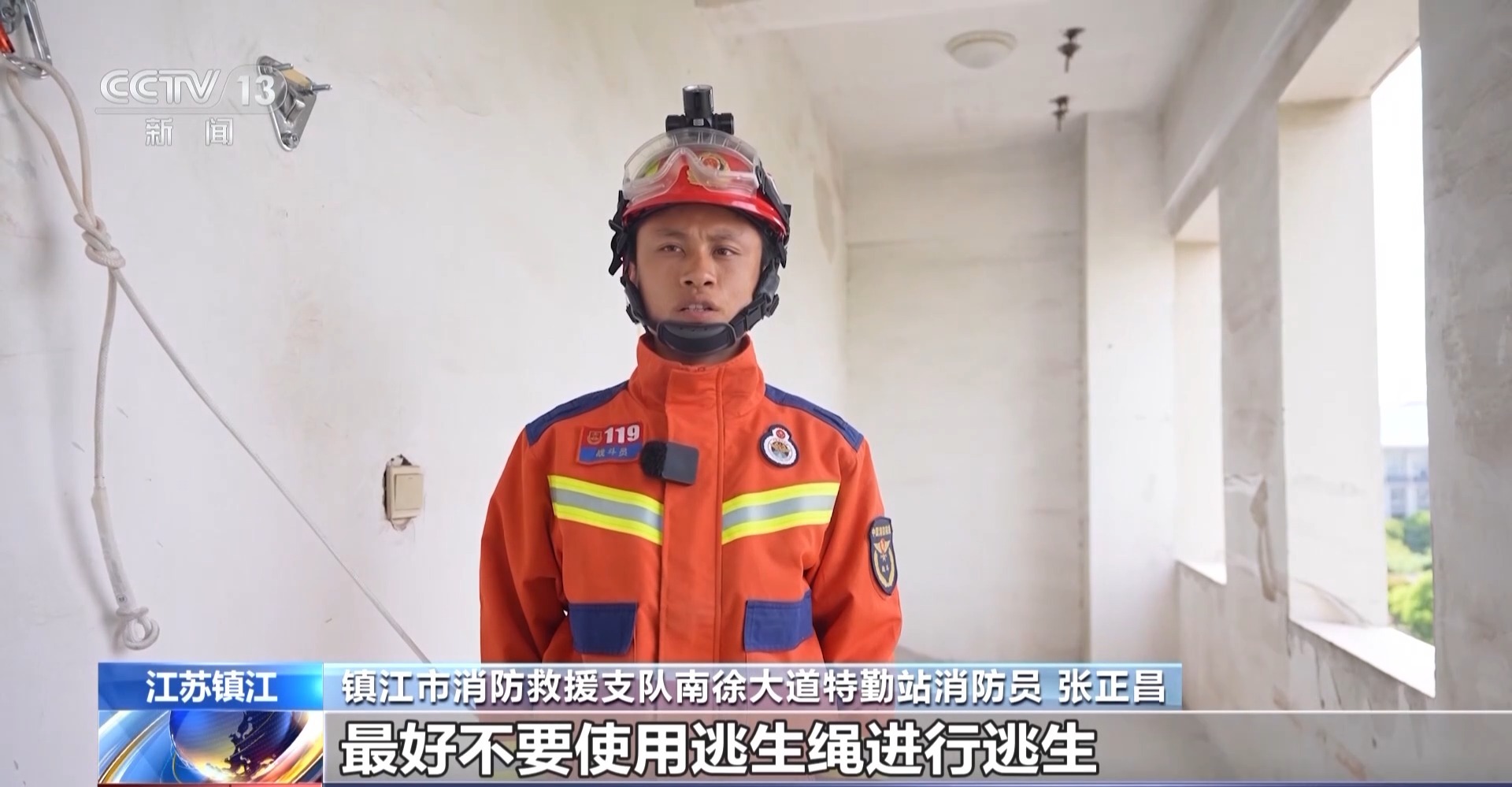 鎮(zhèn)江市消防救援支隊南徐大道特勤站消防員 張正昌:特別是在出窗口的時候需要調(diào)整姿態(tài),下降過程中需要調(diào)整下降節(jié)奏和速度,這些都需要通過不斷強(qiáng)化練習(xí)才能掌握。因此,我們建議,一般情況下,三層以上的住戶未經(jīng)專業(yè)訓(xùn)練,最好不要使用逃生繩進(jìn)行逃生,特別是對于老人和兒童來說更不適合。