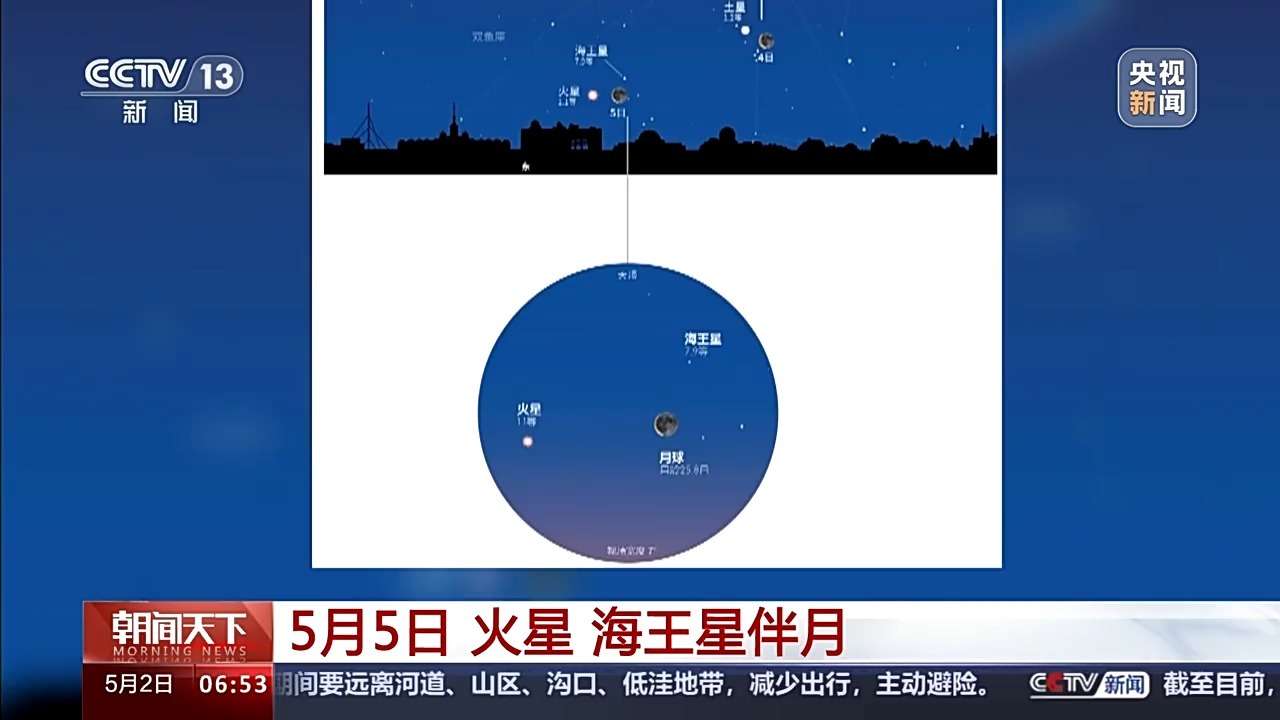 5月5日凌晨,月亮來到火星與海王星附近,先后發(fā)生月掩海王星和月掩火星現(xiàn)象。月掩海王星將發(fā)生在5日凌晨3時(shí),而月掩火星則發(fā)生在上午11時(shí)左右,雖然我國大部分地區(qū)都能觀測,但是在白天進(jìn)行觀測難度不小。