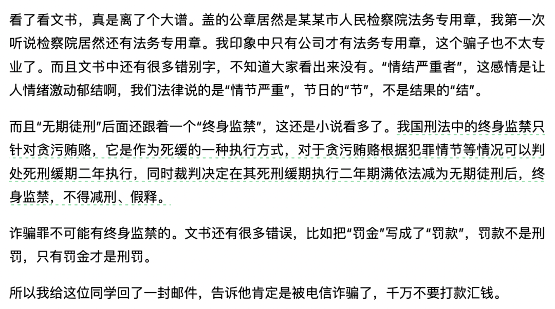 羅翔在文中曬出了一位留學(xué)生收到的“引渡逮捕命令書”,該文件漏洞百出,他提醒海外留學(xué)生,千萬(wàn)別上當(dāng),