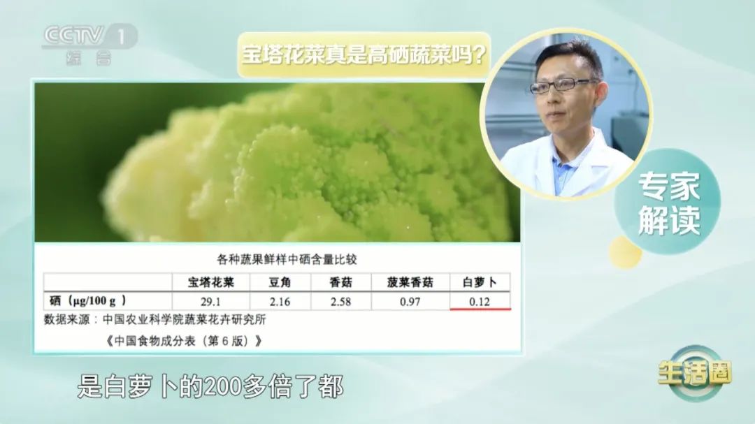 普通人群每日對硒的需求量為20~200微克之間,一天食用一棵寶塔花菜,就能滿足人體對有機硒的需求。