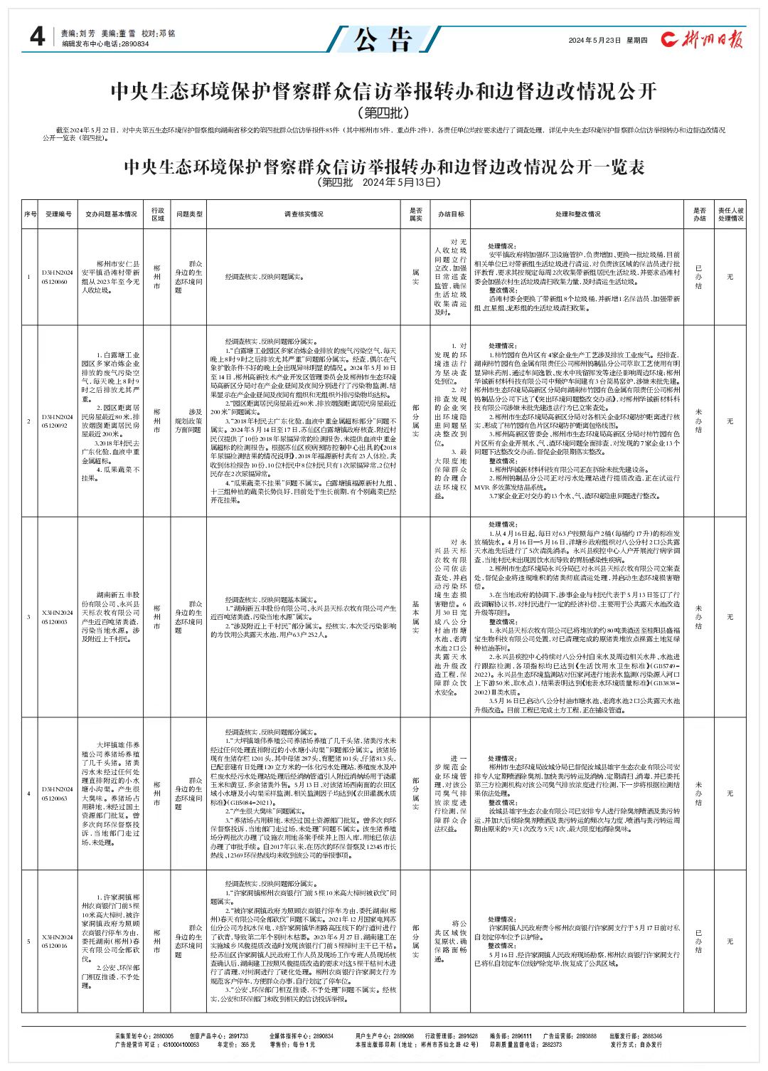 中央生態(tài)環(huán)境保護(hù)督察群眾信訪舉報(bào)轉(zhuǎn)辦和邊督邊改情況公開一覽表 (第四批 2024年5月13日)