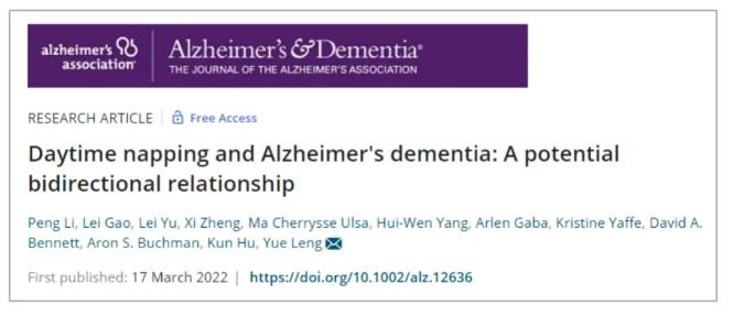 2022年一項(xiàng)刊發(fā)在《阿爾茨海默氏癥與癡呆癥》雜志的研究發(fā)現(xiàn),午睡和大腦衰老之間存在雙向關(guān)系。白天過度午睡會增加晚年患阿爾茨海默病的風(fēng)險(xiǎn)。與此同時,隨著患者年齡的增長,患有阿爾茨海默病會導(dǎo)致白天午睡增加。