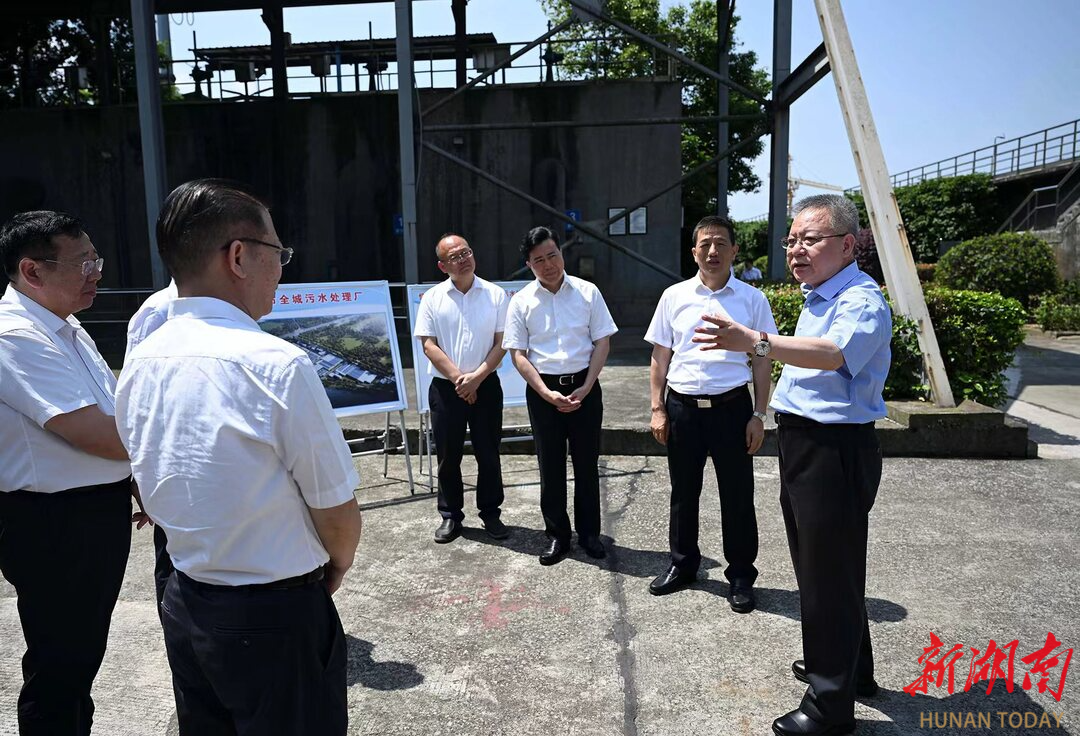 (5月28日,沈曉明在懷化市全城污水處理廠實(shí)地察看進(jìn)水口采樣點(diǎn)、中控室和實(shí)驗(yàn)室,了解監(jiān)測數(shù)據(jù)記錄、水樣檢測等情況。)