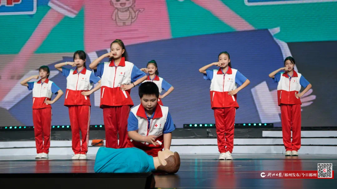 “老師,這位同學(xué)暈倒了?!薄罢堖@位同學(xué)去撥打120;請這位同學(xué)馬上去找校醫(yī),取AED;其他同學(xué)請散開?!苯?,在2024年“紅十字博愛周”活動啟動儀式暨“大愛福城·最美郴州”紅十字故事匯演上,來自市十二完小青少年志愿服務(wù)隊的同學(xué)和老師們帶來的情景劇《心肺復(fù)蘇指南》,贏得了現(xiàn)場觀眾的陣陣掌聲。