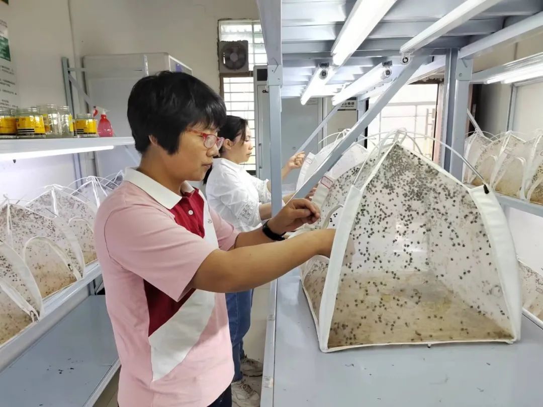 郴州市天敵昆蟲繁育基地,高級(jí)農(nóng)藝師肖艷松在觀察益蝽