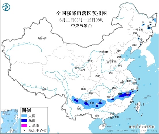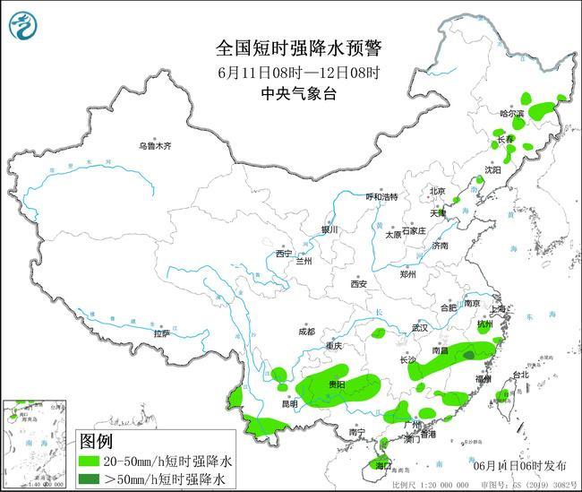 預計,6月11日08時至12日08時,浙江南部、福建北部、江西中北部、湖南南部、廣西北部、貴州中南部、云南東北部、四川南部,以及東北地區(qū)東部、臺灣島西南部等地部分地區(qū)有大到暴雨,其中,江西東北部、浙江西南部、福建西北部等地局地有大暴雨(100~120毫米)。上述部分地區(qū)伴有短時強降水(最大小時降雨量30~50毫米,局地可超過70毫米),局地有雷暴大風等強對流天氣。