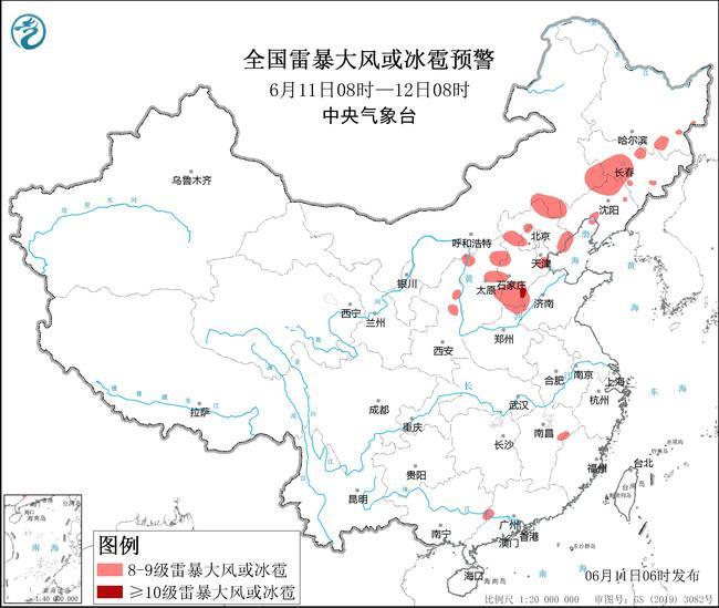 預計6月11日08時至12日08時,內蒙古東南部、黑龍江東南部、吉林中部、遼寧北部、陜西北部、山西中北部、河北西部和南部、北京西部、天津南部等地的部分地區(qū)將有8級以上雷暴大風或冰雹天氣,其中,河北南部的部分地區(qū)將有10級以上雷暴大風,最大風力可達11級以上;
