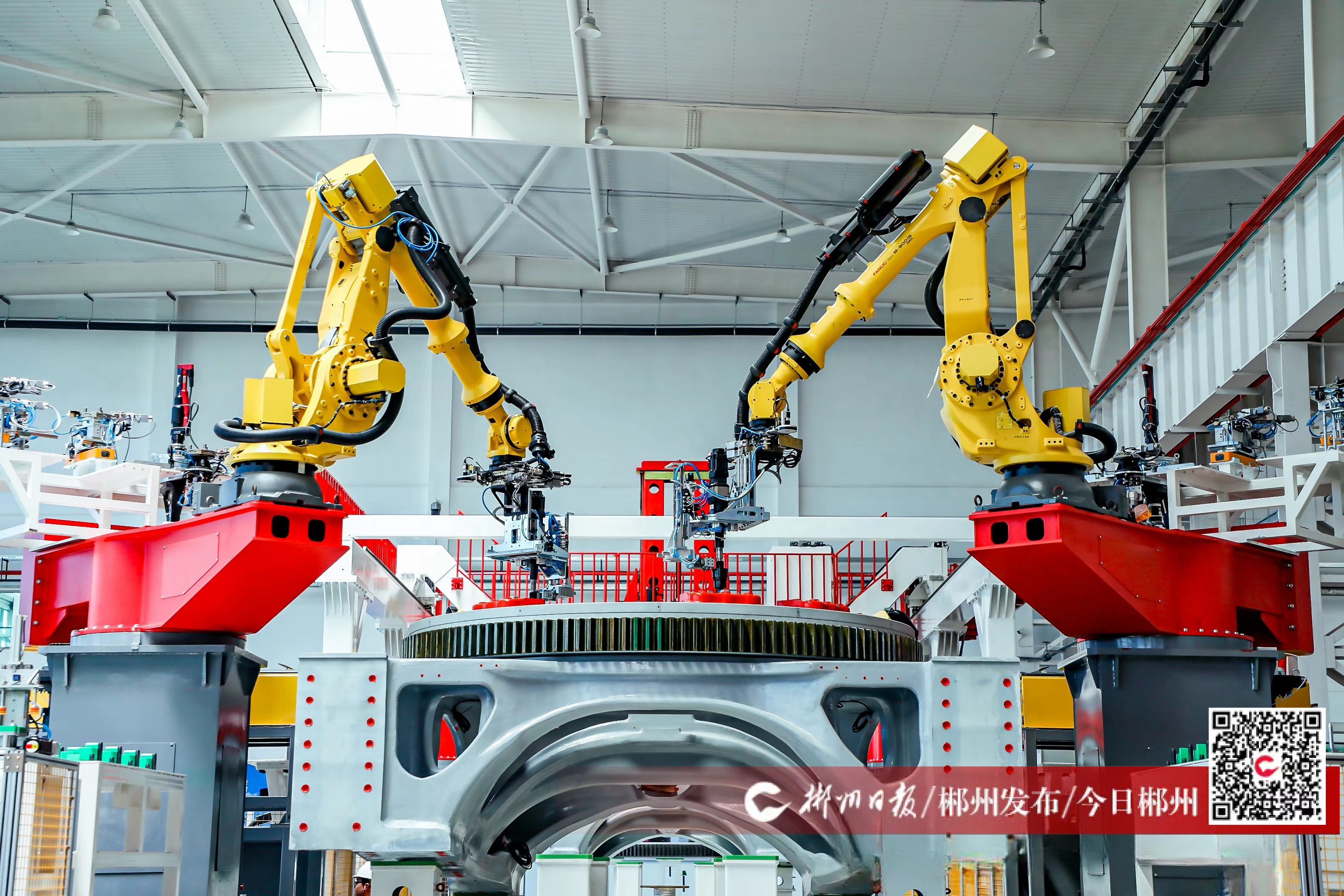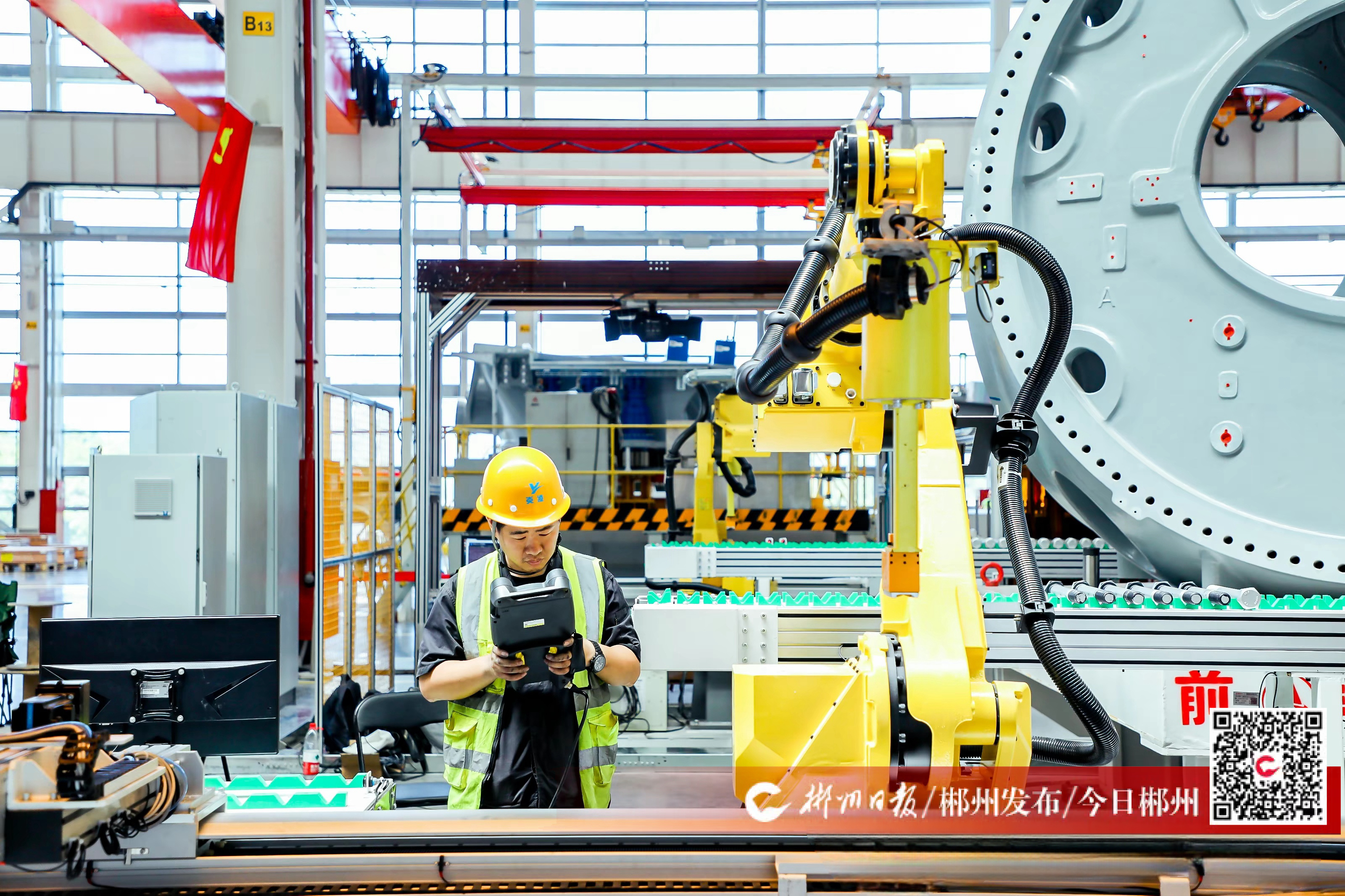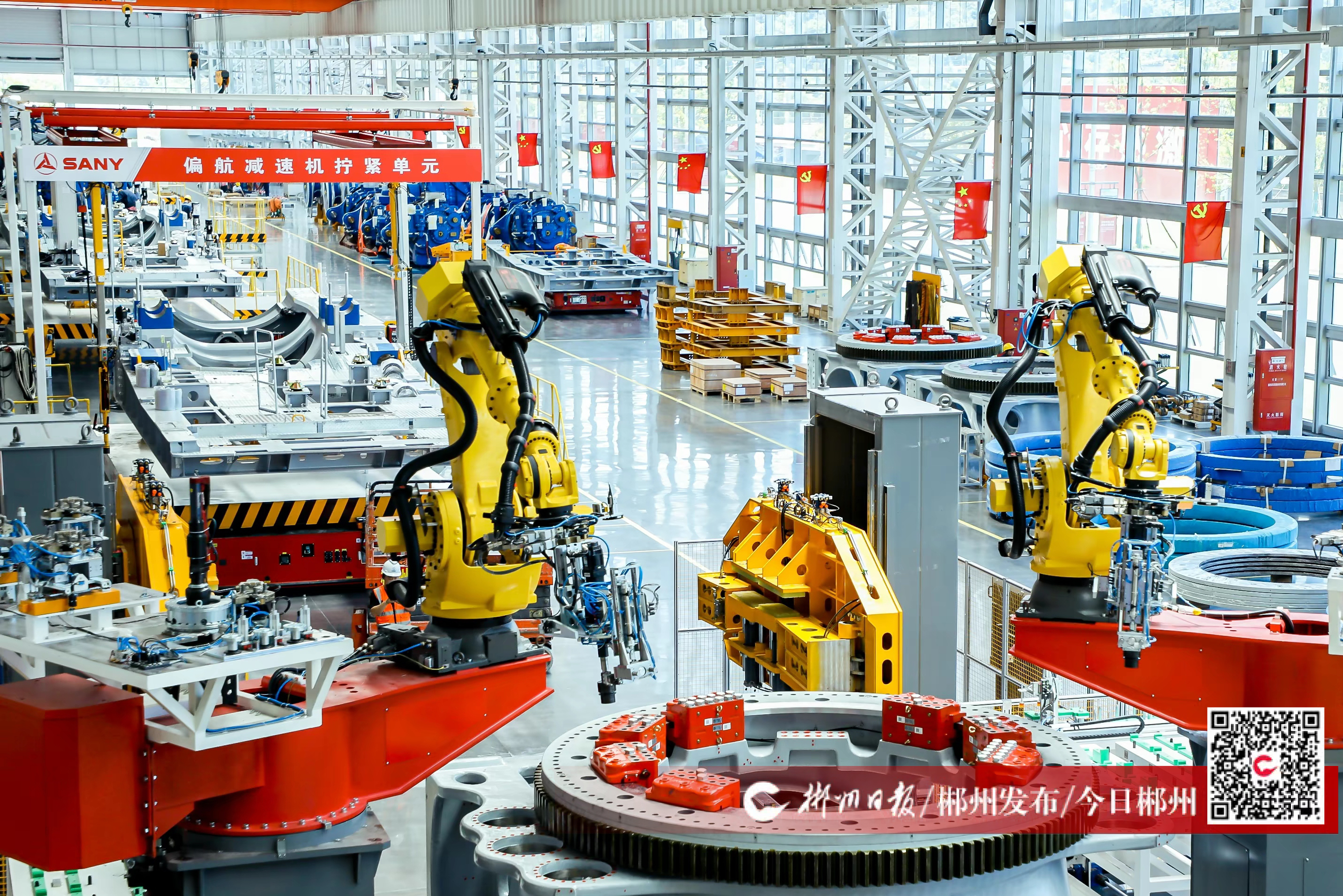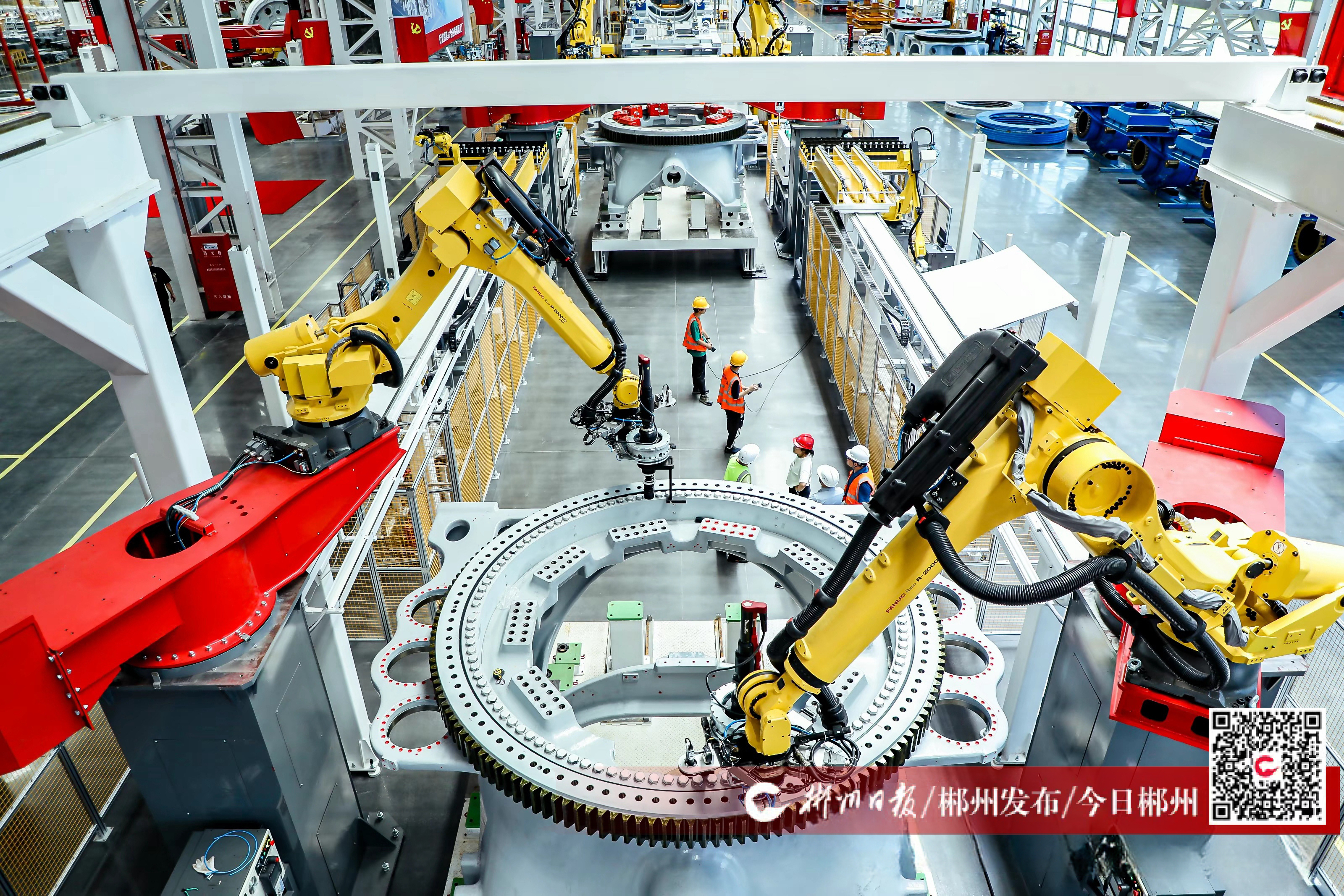 7月5日,三一重能裝備(郴州)有限公司主機(jī)廠房內(nèi),工業(yè)機(jī)械臂正在進(jìn)行數(shù)字化智能生產(chǎn)。今年上半年,該企業(yè)運(yùn)行情況良好,下線機(jī)組數(shù)量持續(xù)增長,產(chǎn)品銷往全國各地。據(jù)了解,該公司主機(jī)廠房于去年上半年完成數(shù)字化改造,在行業(yè)內(nèi)率先使用偏航軸承裝配機(jī)器人、制動器裝配機(jī)器人、偏航底架自動翻轉(zhuǎn)機(jī)器人等自動化裝配技術(shù),3小時可以生產(chǎn)一臺大兆瓦主機(jī),與傳統(tǒng)工廠相比,單位面積生產(chǎn)量至少提升1.34倍,一年大約可以節(jié)約30萬元人工成本。