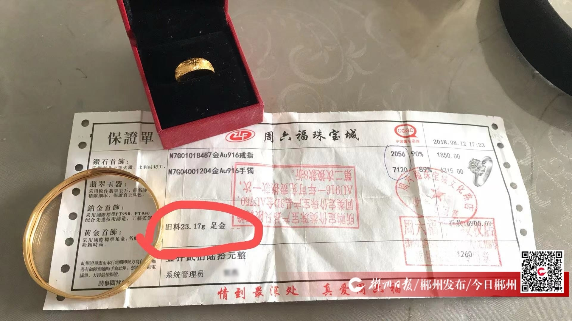根據(jù)當時開出的單據(jù)上顯示,鄺女士的母親于2018年8月12日17時23分,將一只舊料23.17克足金在周六福折款為6905元,補了1260元差價后,換購了一只型號為N7G01018487金Au916戒指與一只N7G04001204金Au916手鐲,其中戒指的折后價為1850元,手鐲的折后價為6315元。單據(jù)上并未顯示換購的戒指與手鐲的重量。